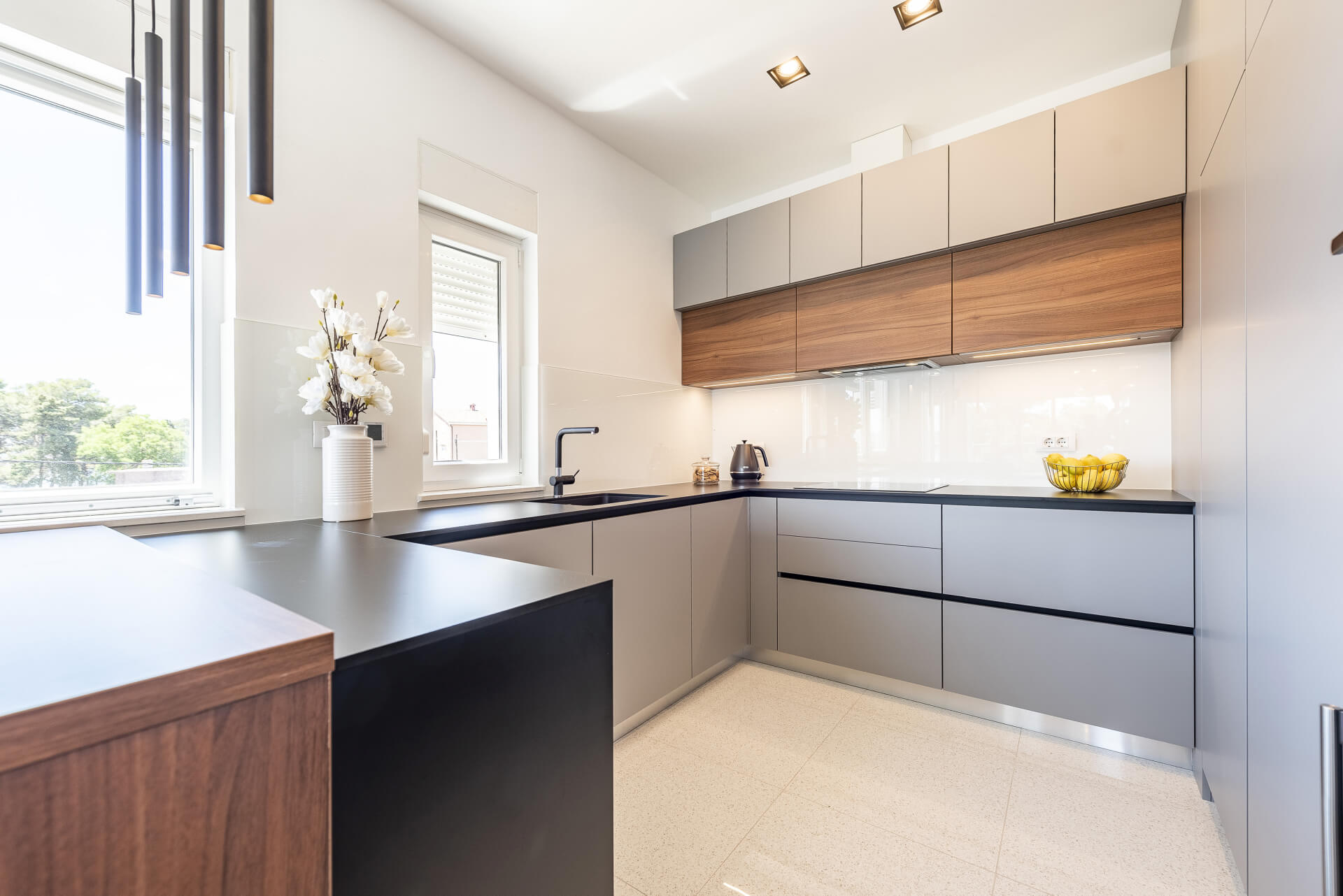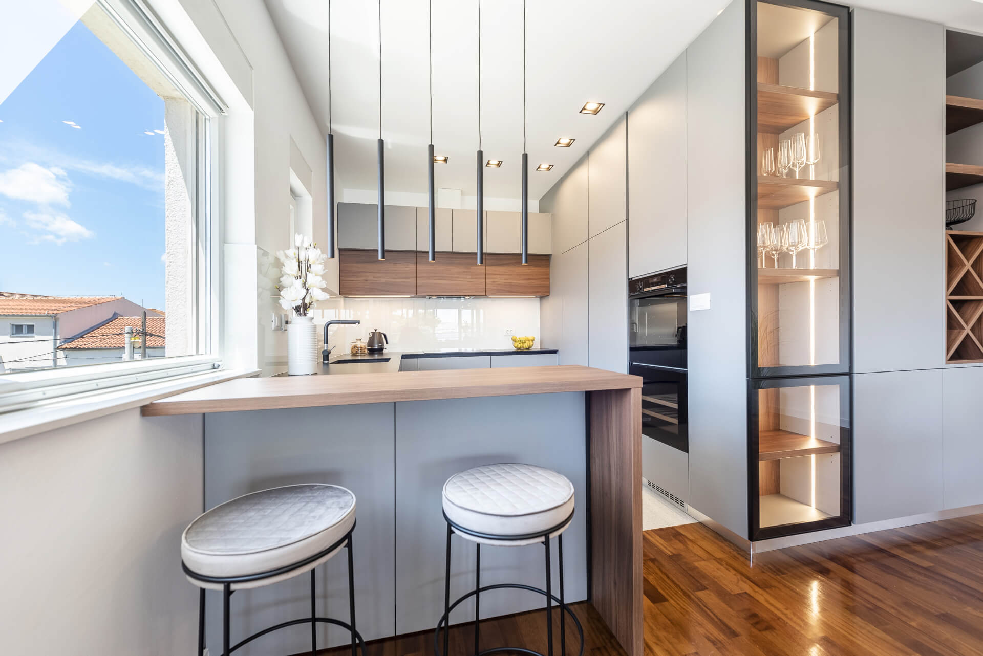 U kupaonicama i wc-u su potpuno porušene postojeće pločice i sanitarije te zamijenjene novim pločicama, sanitarijama, kupaonskim ormarićima, tuš paravanima i galanterijom. Na terasama su izgrađeni vanjski roštilj, tuš, postavljena pergola. U cijelom stanu je postavljena nova rasvjeta, spušteni stropovi, dio stana je obojen u neutralnu sivu boju te su pojedini zidovi naglašeni tapetama.